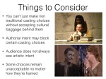 Some explanation on types non traditional casting based on a recent lecture. Basically “colorblind” doesn’t quite cut it for what we’re trying to achieve here.