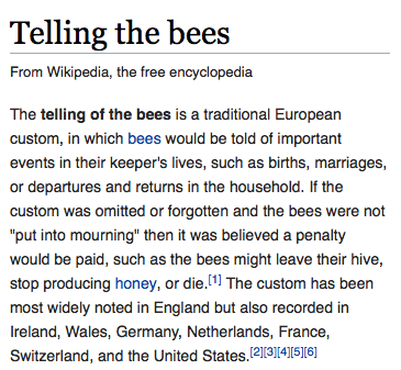 Little is known about the origins of this practice, although there is some unfounded speculation that it is loosely derived from or perhaps inspired by ancient Aegean notions about bees’ ability to bridge the natural world with the afterlife.