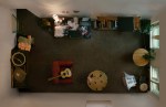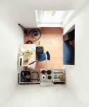 Through challenging camera angles Menno Aden abstracts most familiar actual living environments and public interiors into flattened two-dimensional scale models. A camera that the artist installed on the ceiling of various rooms takes pictures downwards of the interiors. The resulting images lay out space in symmetrical compositions that look like assemblages stripped off any kind of objectivity. The views into private homes and secret retreats bring up associations of the ubiquitous observation camera. The notion of surveillance is systematically played out by the artist to hint at society’s voyeuristic urge that popular culture has made mainstream.
