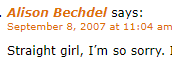 i love how everybody just reblogs it as it is but if anyone is wondering about the context it’s from the comments on the alison’s blog. someone with a username straight girl was having some troubles with the website and alison was apologizing to her